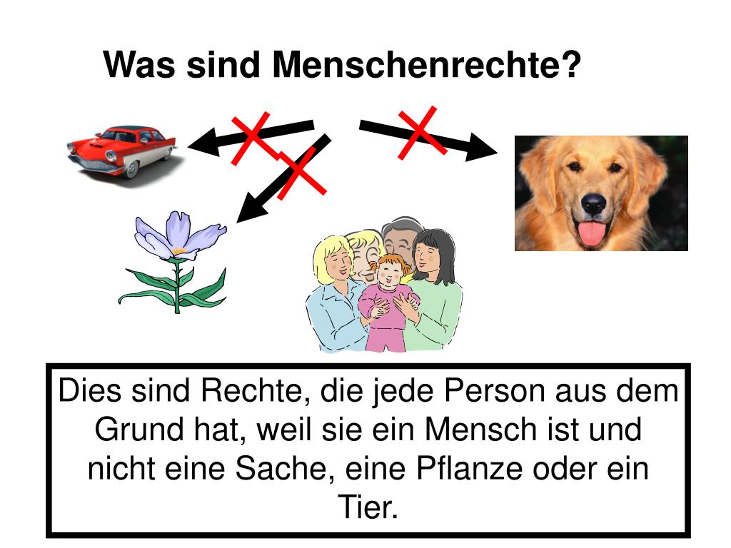 Was sind Menschenrechte? Dies sind Rechte, die jede Person aus dem Grund hat, weil sie ein Mensch ist und nicht eine Sache, eine Pflanze oder ein Tier.