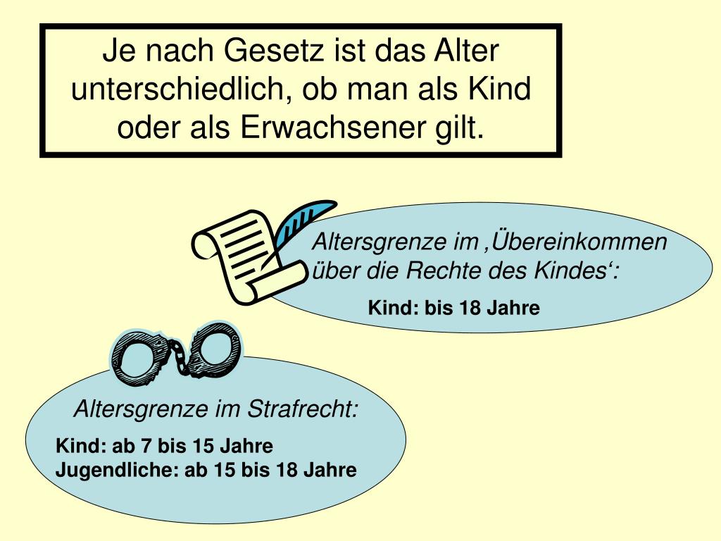 Altersgrenze im ‚Übereinkommen über die Rechte des Kindes‘: Altersgrenze im Strafrecht: Je nach Gesetz ist das Alter unterschiedlich, ob man als Kind oder als Erwachsener gilt. Kind: bis 18 Jahre Kind: ab 7 bis 15 Jahre Jugendliche: ab 15 bis 18 Jahre