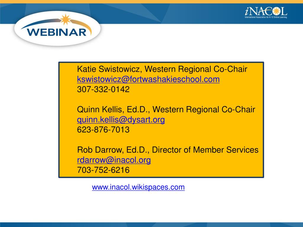 Katie Swistowicz, Western Regional Co-Chair • kswistowicz@fortwashakieschool.com • 307-332-0142 • Quinn Kellis, Ed.D., Western Regional Co-Chair • quinn.kellis@dysart.org • 623-876-7013 • Rob Darrow, Ed.D., Director of Member Services • rdarrow@inacol.org • 703-752-6216 www.inacol.wikispaces.com