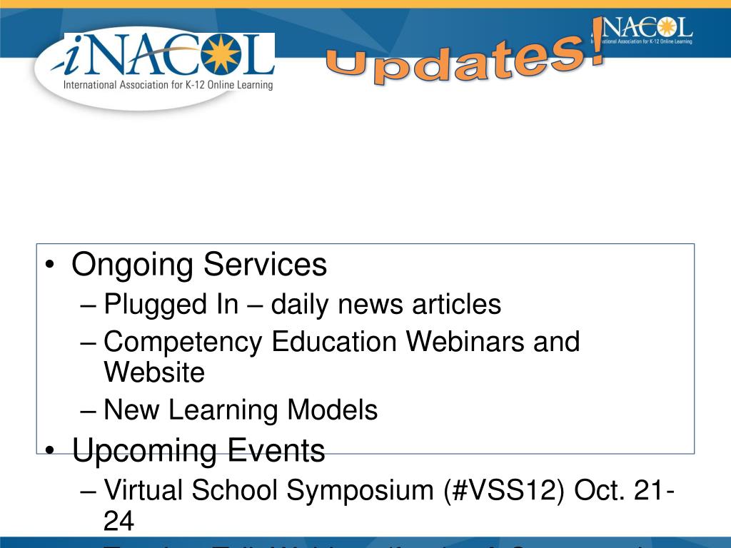 Updates! • Ongoing Services • Plugged In – daily news articles • Competency Education Webinars and Website • New Learning Models • Upcoming Events • Virtual School Symposium (#VSS12) Oct. 21-24 • Teacher Talk Webinar (free) – A Conversation with Online Teachers of the Year – Sept. 20, 6 pm EST • Membership Annual Update – Sept. 21, 3 est