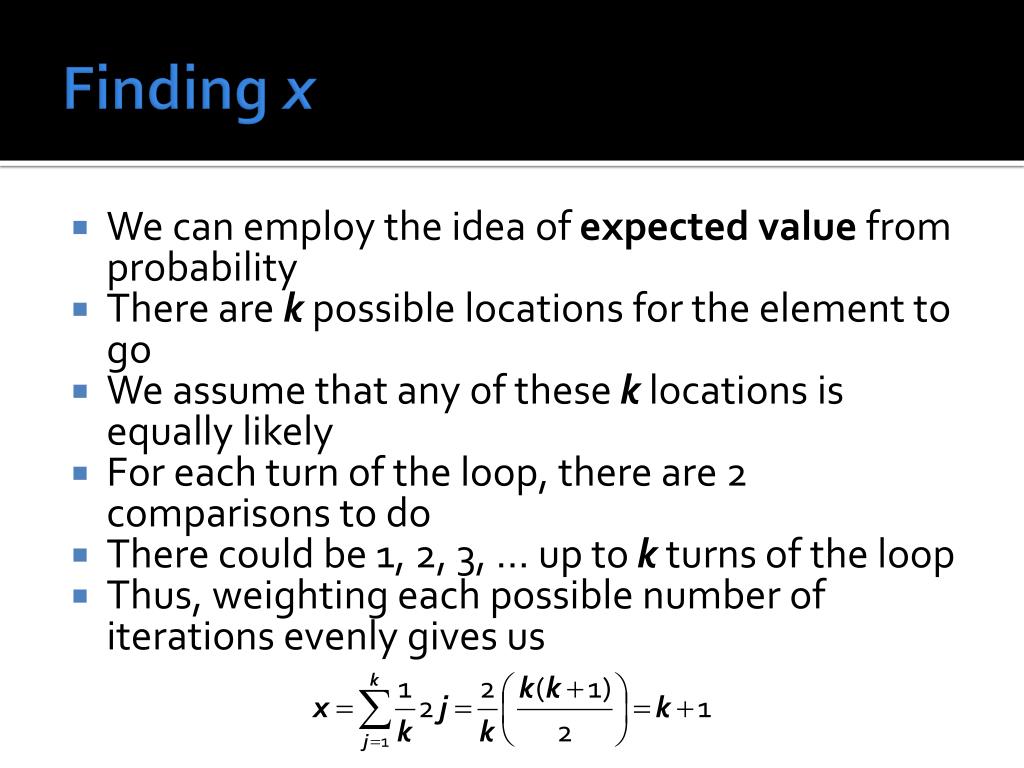 Finding x • We can employ the idea of expected value from probability • There are k possible locations for the element to go • We assume that any of these k locations is equally likely • For each turn of the loop, there are 2 comparisons to do • There could be 1, 2, 3, … up to k turns of the loop • Thus, weighting each possible number of iterations evenly gives us