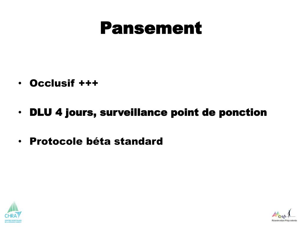 Pansement • Occlusif +++ • DLU 4 jours, surveillance point de ponction • Protocole béta standard