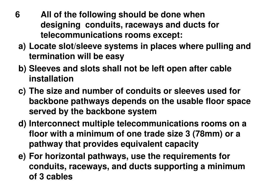 6 All of the following should be done when designing conduits, raceways and ducts for telecommunications rooms except: a) Locate slot/sleeve systems in places where pulling and termination will be easy b) Sleeves and slots shall not be left open after cable installation c) The size and number of conduits or sleeves used for backbone pathways depends on the usable floor space served by the backbone system d) Interconnect multiple telecommunications rooms on a floor with a minimum of one trade size 3 (78mm) or a pathway that provides equivalent capacity e) For horizontal pathways, use the requirements for conduits, raceways, and ducts supporting a minimum of 3 cables