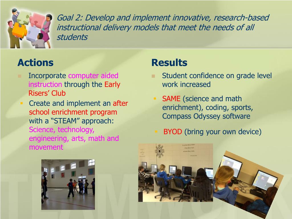 Goal 2: Develop and implement innovative, research-based instructional delivery models that meet the needs of all students Actions Results Student confidence on grade level work increased • Incorporate computer aided instruction through the Early Risers’ Club • SAME (science and math enrichment), coding, sports, Compass Odyssey software • Create and implement an after school enrichment program with a “STEAM” approach: Science, technology, engineering, arts, math and movement • BYOD (bring your own device)