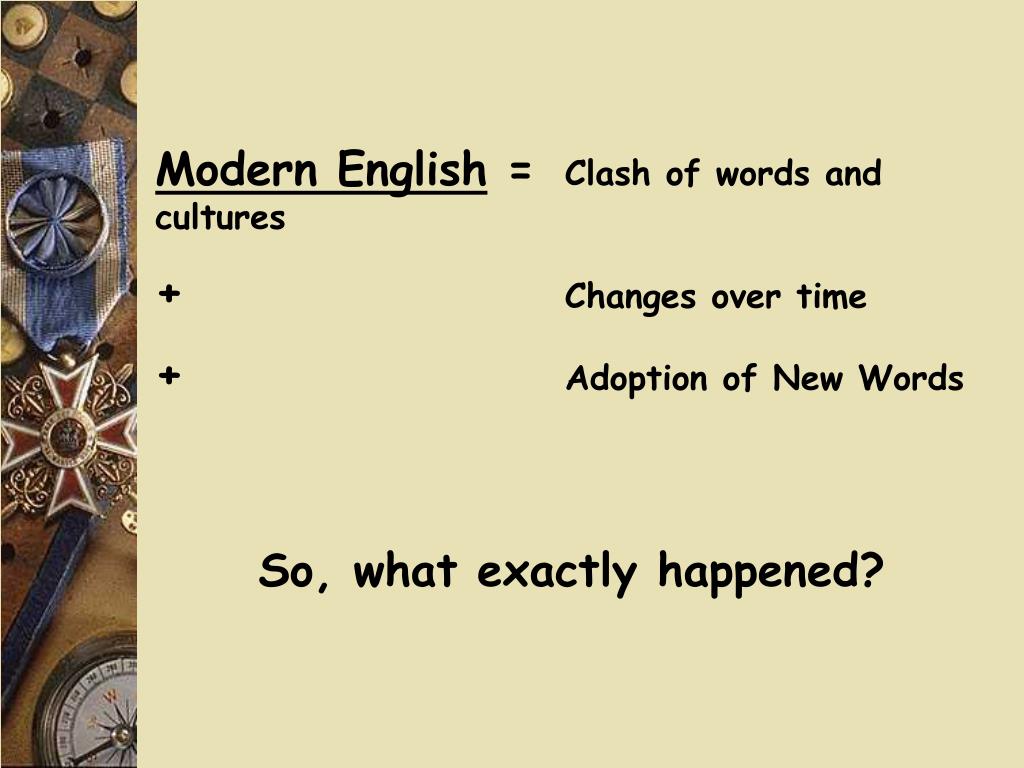 Modern English = Clash of words and cultures + Changes over time + Adoption of New Words So, what exactly happened?
