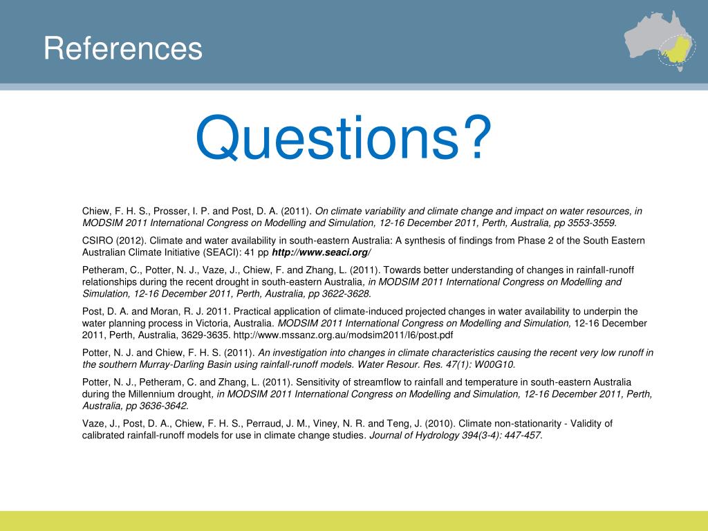 References Questions? Chiew, F. H. S., Prosser, I. P. and Post, D. A. (2011). On climate variability and climate change and impact on water resources, in MODSIM 2011 International Congress on Modelling and Simulation, 12-16 December 2011, Perth, Australia, pp 3553-3559. CSIRO (2012). Climate and water availability in south-eastern Australia: A synthesis of findings from Phase 2 of the South Eastern Australian Climate Initiative (SEACI): 41 pp http://www.seaci.org/ Petheram, C., Potter, N. J., Vaze, J., Chiew, F. and Zhang, L. (2011). Towards better understanding of changes in rainfall-runoff relationships during the recent drought in south-eastern Australia, in MODSIM 2011 International Congress on Modelling and Simulation, 12-16 December 2011, Perth, Australia, pp 3622-3628. Post, D. A. and Moran, R. J. 2011. Practical application of climate-induced projected changes in water availability to underpin the water planning process in Victoria, Australia. MODSIM 2011 International Congress on Modelling and Simulation, 12-16 December 2011, Perth, Australia, 3629-3635. http://www.mssanz.org.au/modsim2011/I6/post.pdf Potter, N. J. and Chiew, F. H. S. (2011). An investigation into changes in climate characteristics causing the recent very low runoff in the southern Murray-Darling Basin using rainfall-runoff models. Water Resour. Res. 47(1): W00G10. Potter, N. J., Petheram, C. and Zhang, L. (2011). Sensitivity of streamflow to rainfall and temperature in south-eastern Australia during the Millennium drought, in MODSIM 2011 International Congress on Modelling and Simulation, 12-16 December 2011, Perth, Australia, pp 3636-3642. Vaze, J., Post, D. A., Chiew, F. H. S., Perraud, J. M., Viney, N. R. and Teng, J. (2010). Climate non-stationarity - Validity of calibrated rainfall-runoff models for use in climate change studies. Journal of Hydrology 394(3-4): 447-457.