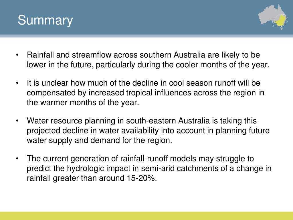 Summary • Rainfall and streamflow across southern Australia are likely to be lower in the future, particularly during the cooler months of the year. • It is unclear how much of the decline in cool season runoff will be compensated by increased tropical influences across the region in the warmer months of the year. • Water resource planning in south-eastern Australia is taking this projected decline in water availability into account in planning future water supply and demand for the region. • The current generation of rainfall-runoff models may struggle to predict the hydrologic impact in semi-arid catchments of a change in rainfall greater than around 15-20%.