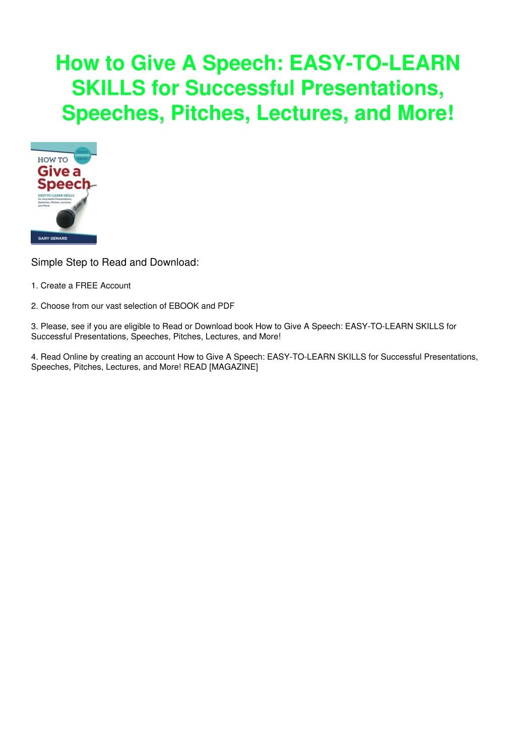 How to Give A Speech: EASY-TO-LEARN SKILLS for Successful Presentations, Speeches, Pitches, Lectures, and More! Simple Step to Read and Download: 1. Create a FREE Account 2. Choose from our vast selection of EBOOK and PDF 3. Please, see if you are eligible to Read or Download book How to Give A Speech: EASY-TO-LEARN SKILLS for Successful Presentations, Speeches, Pitches, Lectures, and More! 4. Read Online by creating an account How to Give A Speech: EASY-TO-LEARN SKILLS for Successful Presentations, Speeches, Pitches, Lectures, and More! READ [MAGAZINE]