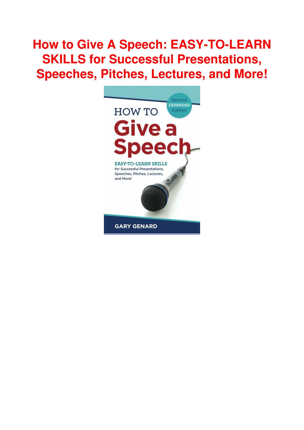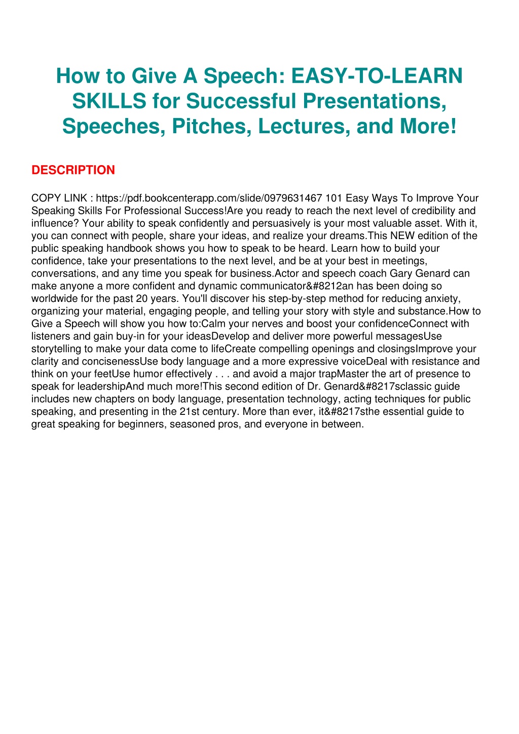 How to Give A Speech: EASY-TO-LEARN SKILLS for Successful Presentations, Speeches, Pitches, Lectures, and More! DESCRIPTION COPY LINK : https://pdf.bookcenterapp.com/slide/0979631467 101 Easy Ways To Improve Your Speaking Skills For Professional Success!Are you ready to reach the next level of credibility and influence? Your ability to speak confidently and persuasively is your most valuable asset. With it, you can connect with people, share your ideas, and realize your dreams.This NEW edition of the public speaking handbook shows you how to speak to be heard. Learn how to build your confidence, take your presentations to the next level, and be at your best in meetings, conversations, and any time you speak for business.Actor and speech coach Gary Genard can make anyone a more confident and dynamic communicator—an has been doing so worldwide for the past 20 years. You'll discover his step-by-step method for reducing anxiety, organizing your material, engaging people, and telling your story with style and substance.How to Give a Speech will show you how to:Calm your nerves and boost your confidenceConnect with listeners and gain buy-in for your ideasDevelop and deliver more powerful messagesUse storytelling to make your data come to lifeCreate compelling openings and closingsImprove your clarity and concisenessUse body language and a more expressive voiceDeal with resistance and think on your feetUse humor effectively . . . and avoid a major trapMaster the art of presence to speak for leadershipAnd much more!This second edition of Dr. Genard’sclassic guide includes new chapters on body language, presentation technology, acting techniques for public speaking, and presenting in the 21st century. More than ever, it’sthe essential guide to great speaking for beginners, seasoned pros, and everyone in between.
