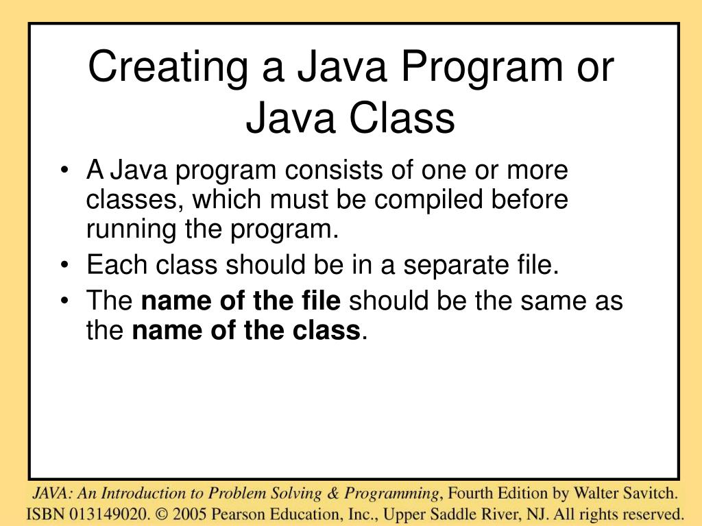 Creating a Java Program or Java Class • A Java program consists of one or more classes, which must be compiled before running the program. • Each class should be in a separate file. • The name of the file should be the same as the name of the class.