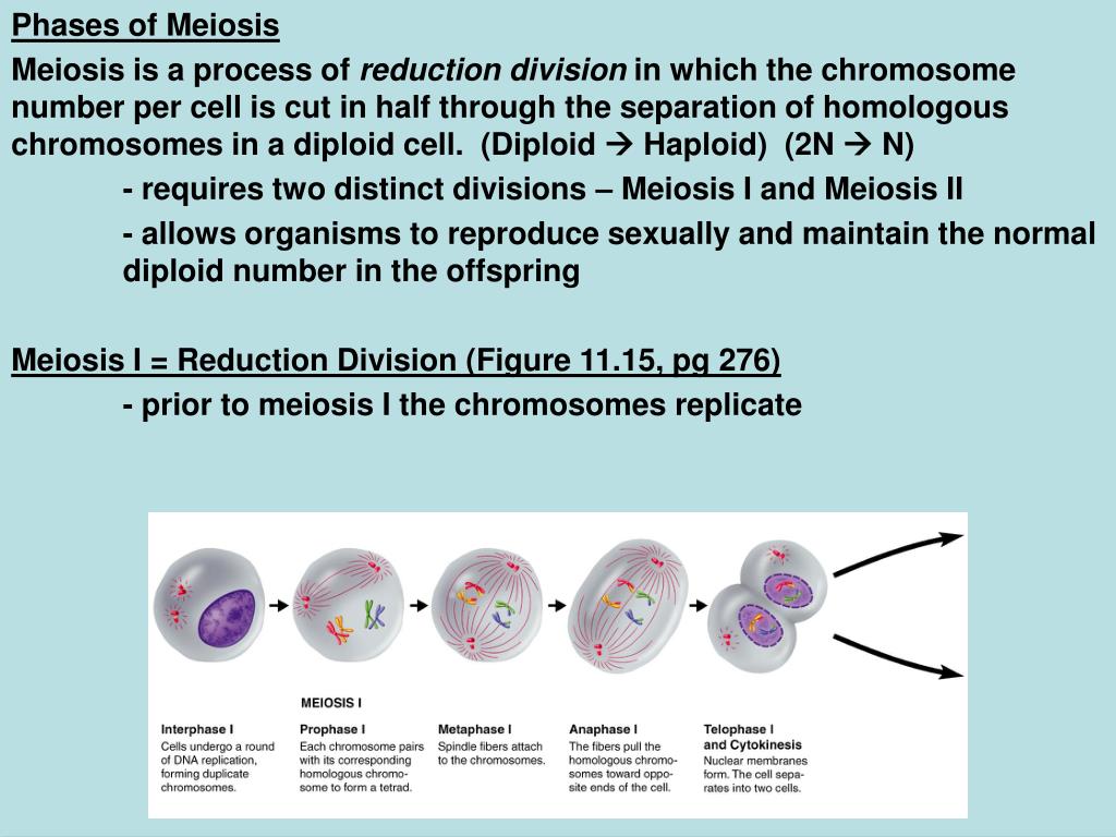 Phases of Meiosis • Meiosis is a process of reduction division in which the chromosome number per cell is cut in half through the separation of homologous chromosomes in a diploid cell. (Diploid Haploid) (2N N) • - requires two distinct divisions – Meiosis I and Meiosis II • - allows organisms to reproduce sexually and maintain the normal diploid number in the offspring • Meiosis I = Reduction Division (Figure 11.15, pg 276) • - prior to meiosis I the chromosomes replicate