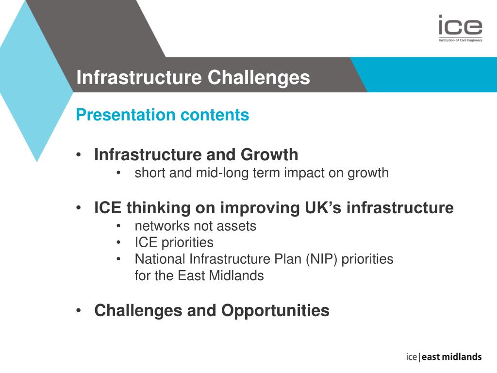 Infrastructure Challenges • Presentation contents • Infrastructure and Growth • short and mid-long term impact on growth • ICE thinking on improving UK’s infrastructure • networks not assets • ICE priorities • National Infrastructure Plan (NIP) prioritiesfor the East Midlands • Challenges and Opportunities