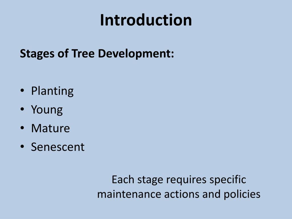 Introduction Stages of Tree Development: Planting Young Mature Senescent Each stage requires specific maintenance actions and policies