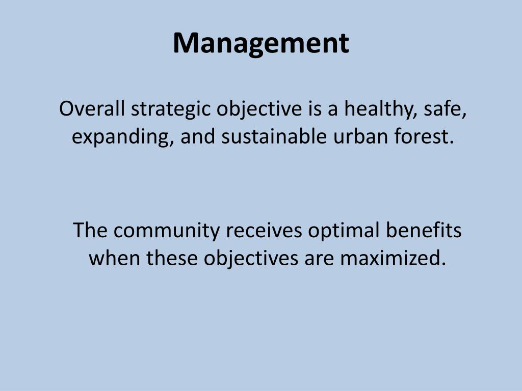 Management The community receives optimal benefits when these objectives are maximized. Overall strategic objective is a healthy, safe, expanding, and sustainable urban forest.