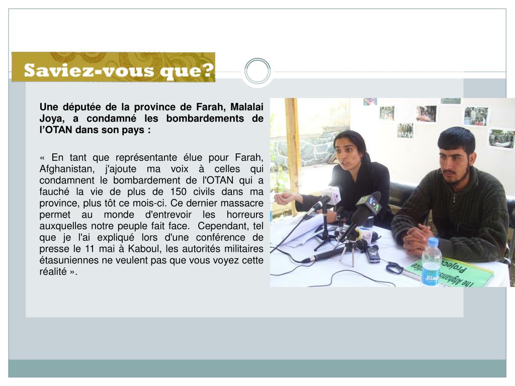 Une députée de la province de Farah, Malalai Joya, a condamné les bombardements de l’OTAN dans son pays : « En tant que représentante élue pour Farah, Afghanistan, j'ajoute ma voix à celles qui condamnent le bombardement de l'OTAN qui a fauché la vie de plus de 150 civils dans ma province, plus tôt ce mois-ci. Ce dernier massacre permet au monde d'entrevoir les horreurs auxquelles notre peuple fait face. Cependant, tel que je l'ai expliqué lors d'une conférence de presse le 11 mai à Kaboul, les autorités militaires étasuniennes ne veulent pas que vous voyez cette réalité ».