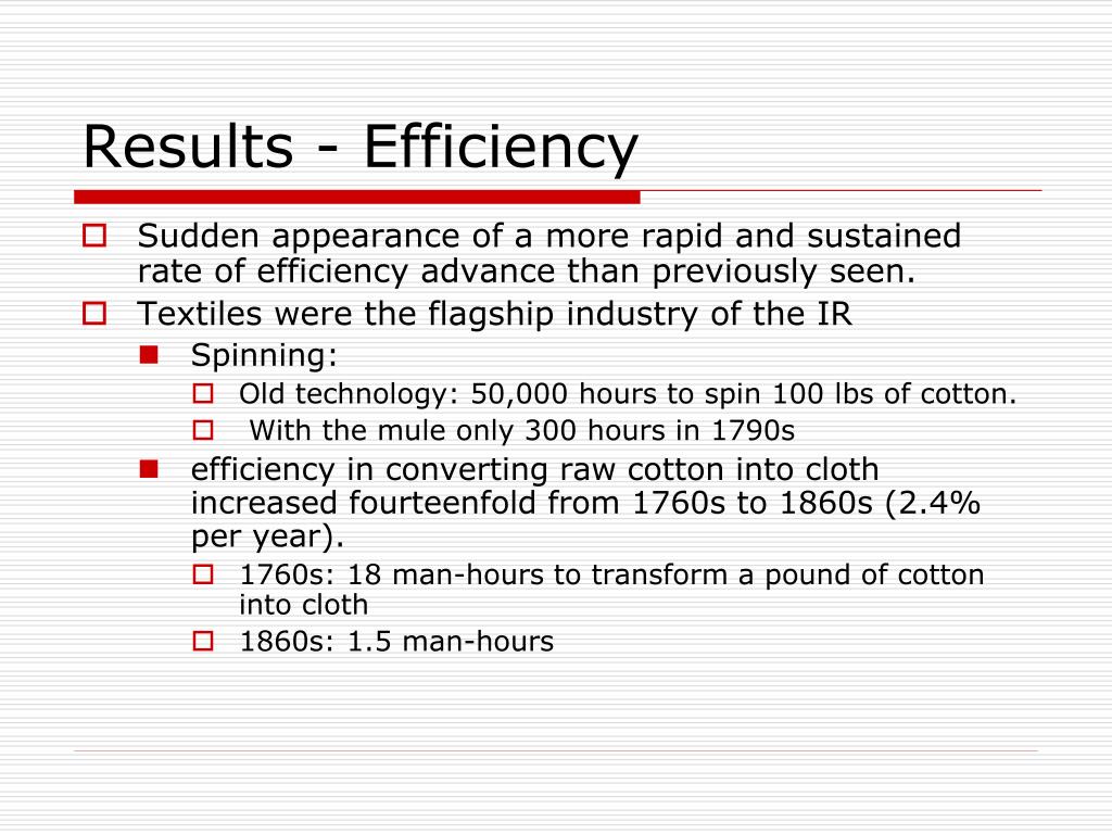 Results - Efficiency • Sudden appearance of a more rapid and sustained rate of efficiency advance than previously seen. • Textiles were the flagship industry of the IR • Spinning: • Old technology: 50,000 hours to spin 100 lbs of cotton. • With the mule only 300 hours in 1790s • efficiency in converting raw cotton into cloth increased fourteenfold from 1760s to 1860s (2.4% per year). • 1760s: 18 man-hours to transform a pound of cotton into cloth • 1860s: 1.5 man-hours