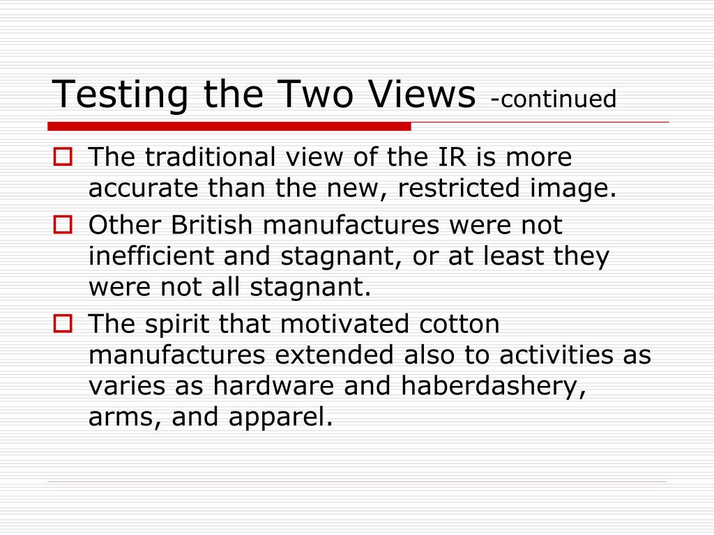 Testing the Two Views -continued • The traditional view of the IR is more accurate than the new, restricted image. • Other British manufactures were not inefficient and stagnant, or at least they were not all stagnant. • The spirit that motivated cotton manufactures extended also to activities as varies as hardware and haberdashery, arms, and apparel.