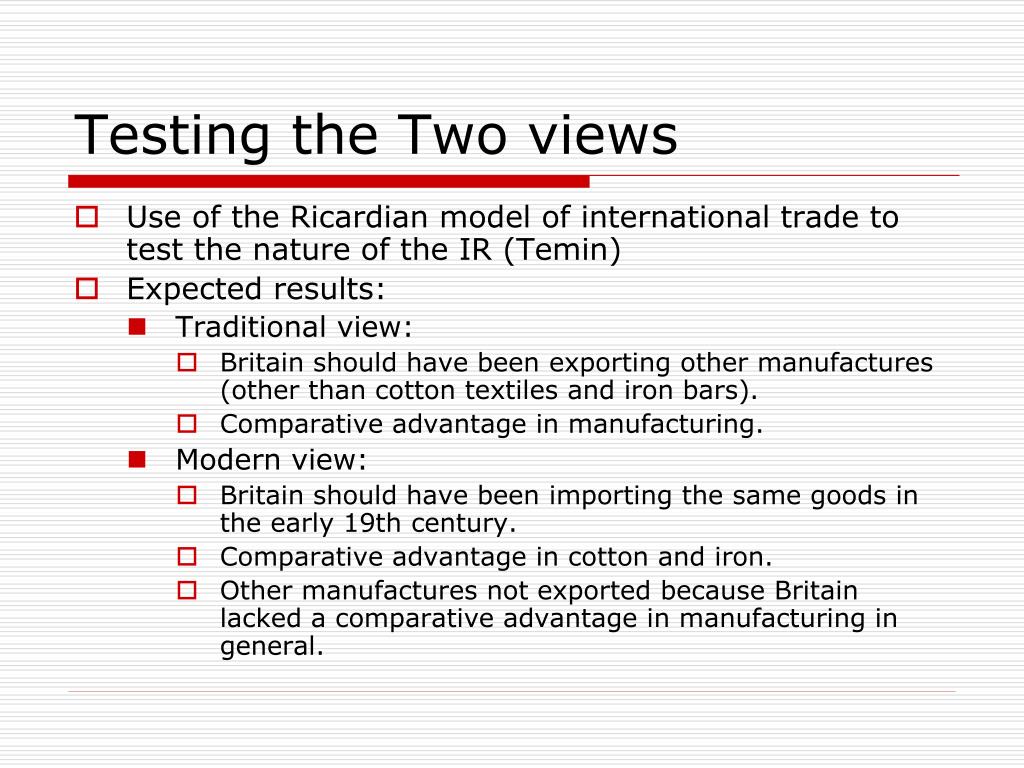 Testing the Two views • Use of the Ricardian model of international trade to test the nature of the IR (Temin) • Expected results: • Traditional view: • Britain should have been exporting other manufactures (other than cotton textiles and iron bars). • Comparative advantage in manufacturing. • Modern view: • Britain should have been importing the same goods in the early 19th century. • Comparative advantage in cotton and iron. • Other manufactures not exported because Britain lacked a comparative advantage in manufacturing in general.