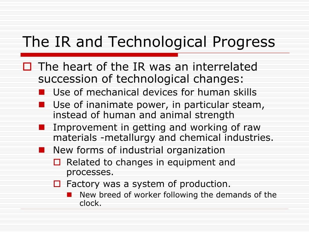 The IR and Technological Progress • The heart of the IR was an interrelated succession of technological changes: • Use of mechanical devices for human skills • Use of inanimate power, in particular steam, instead of human and animal strength • Improvement in getting and working of raw materials -metallurgy and chemical industries. • New forms of industrial organization • Related to changes in equipment and processes. • Factory was a system of production. • New breed of worker following the demands of the clock.
