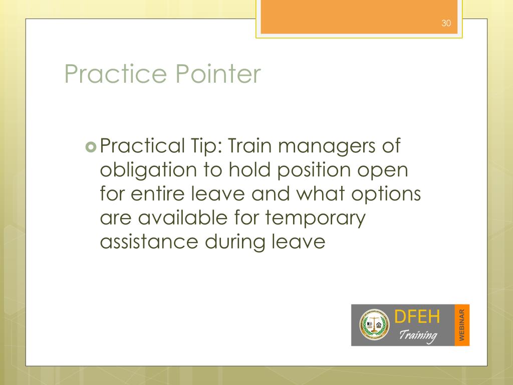 Practice Pointer • Practical Tip: Train managers of obligation to hold position open for entire leave and what options are available for temporary assistance during leave