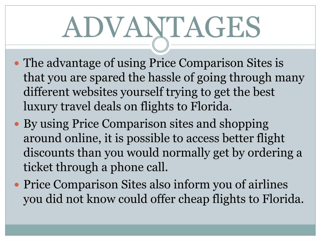 ADVANTAGES The advantage of using Price Comparison Sites is that you are spared the hassle of going through many different websites yourself trying to get the best luxury travel deals on flights to Florida. By using Price Comparison sites and shopping around online, it is possible to access better flight discounts than you would normally get by ordering a ticket through a phone call. Price Comparison Sites also inform you of airlines you did not know could offer cheap flights to Florida.
