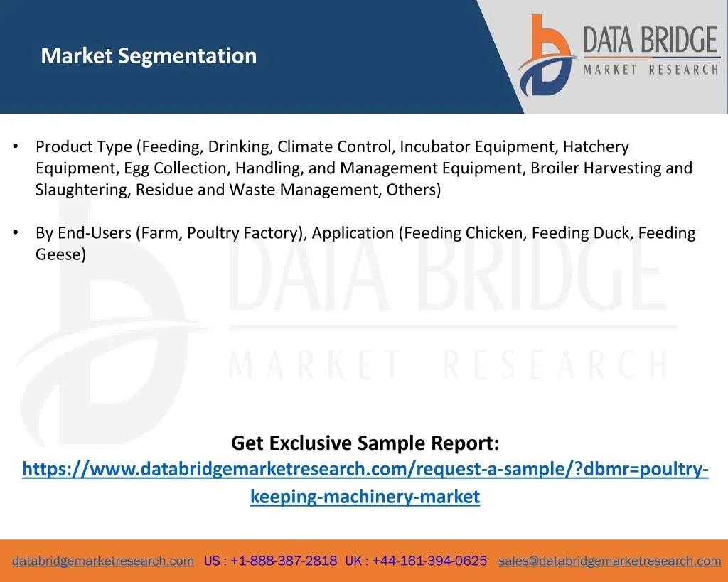 Market Segmentation • Product Type (Feeding, Drinking, Climate Control, Incubator Equipment, Hatchery Equipment, Egg Collection, Handling, and Management Equipment, Broiler Harvesting and Slaughtering, Residue and Waste Management, Others) • By End-Users (Farm, Poultry Factory), Application (Feeding Chicken, Feeding Duck, Feeding Geese) Get Exclusive Sample Report: https://www.databridgemarketresearch.com/request-a-sample/?dbmr=poultry-keeping-machinery-market