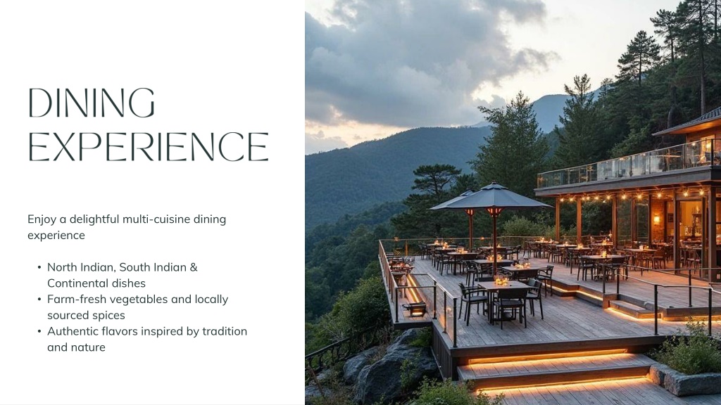 DINING EXPERIENCE • Enjoy a delightful multi-cuisine dining experience • North Indian, South Indian & Continental dishes • Farm-fresh vegetables and locally sourced spices • Authentic flavors inspired by tradition and nature