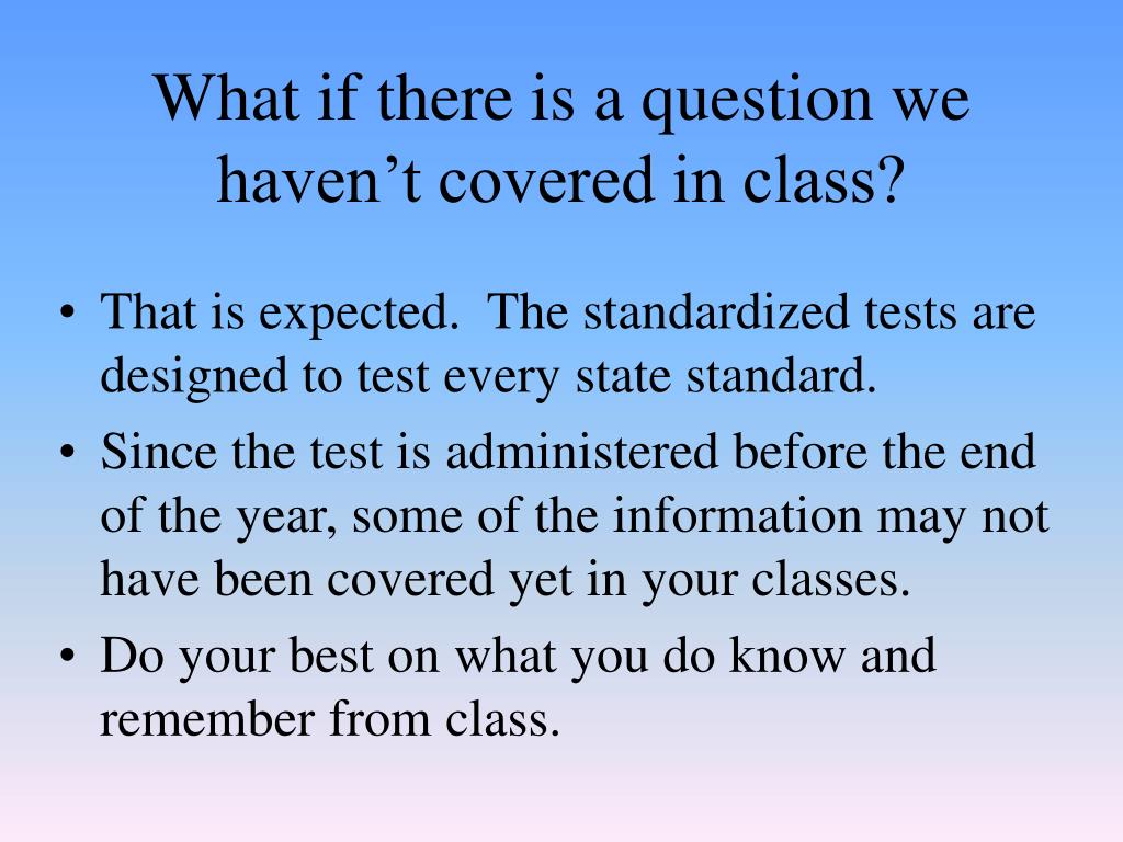 What if there is a question we haven’t covered in class? • That is expected. The standardized tests are designed to test every state standard. • Since the test is administered before the end of the year, some of the information may not have been covered yet in your classes. • Do your best on what you do know and remember from class.