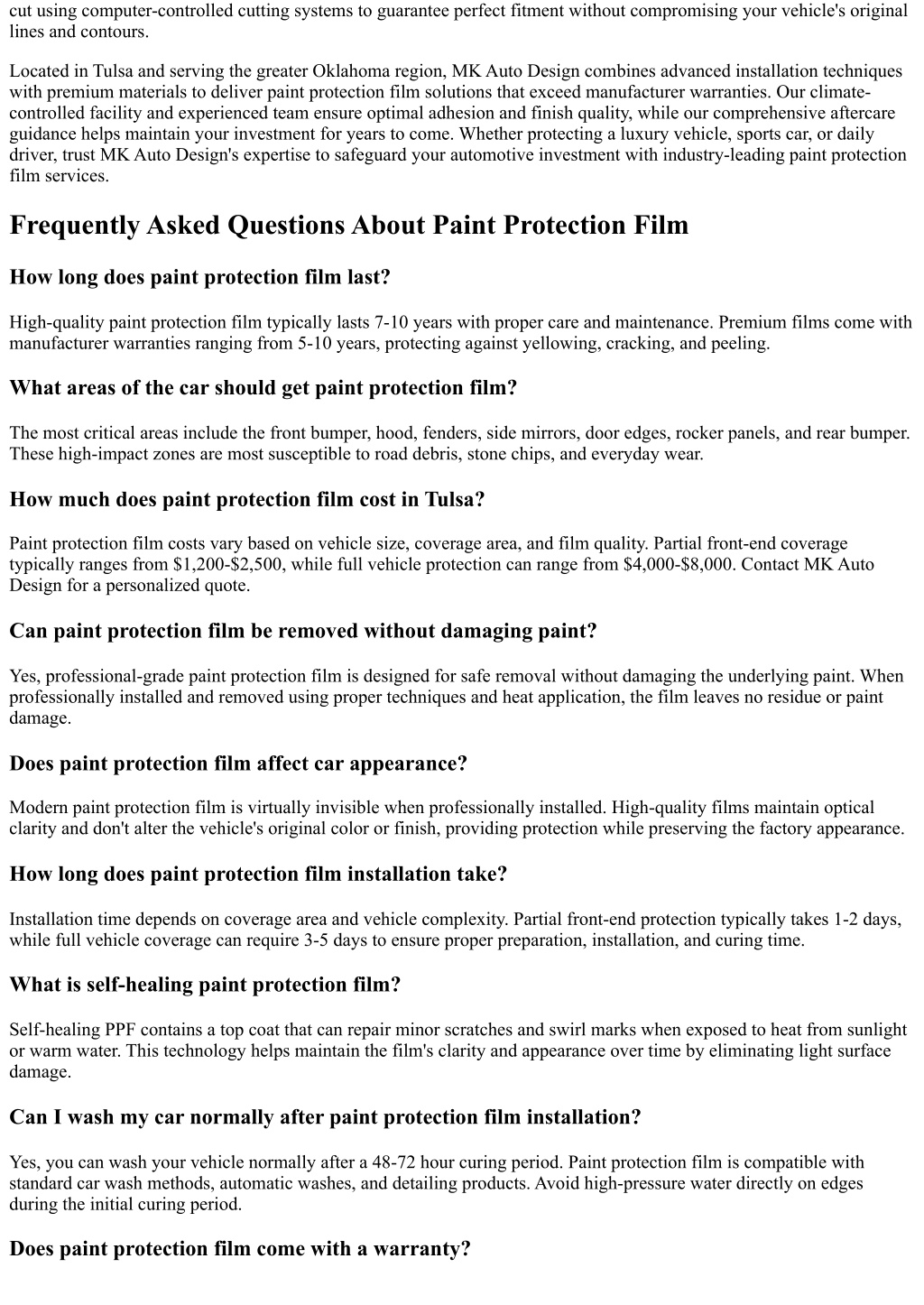 cut using computer-controlled cutting systems to guarantee perfect fitment without compromising your vehicle's original lines and contours. Located in Tulsa and serving the greater Oklahoma region, MK Auto Design combines advanced installation techniques with premium materials to deliver paint protection film solutions that exceed manufacturer warranties. Our climate- controlled facility and experienced team ensure optimal adhesion and finish quality, while our comprehensive aftercare guidance helps maintain your investment for years to come. Whether protecting a luxury vehicle, sports car, or daily driver, trust MK Auto Design's expertise to safeguard your automotive investment with industry-leading paint protection film services. Frequently Asked Questions About Paint Protection Film How long does paint protection film last? High-quality paint protection film typically lasts 7-10 years with proper care and maintenance. Premium films come with manufacturer warranties ranging from 5-10 years, protecting against yellowing, cracking, and peeling. What areas of the car should get paint protection film? The most critical areas include the front bumper, hood, fenders, side mirrors, door edges, rocker panels, and rear bumper. These high-impact zones are most susceptible to road debris, stone chips, and everyday wear. How much does paint protection film cost in Tulsa? Paint protection film costs vary based on vehicle size, coverage area, and film quality. Partial front-end coverage typically ranges from $1,200-$2,500, while full vehicle protection can range from $4,000-$8,000. Contact MK Auto Design for a personalized quote. Can paint protection film be removed without damaging paint? Yes, professional-grade paint protection film is designed for safe removal without damaging the underlying paint. When professionally installed and removed using proper techniques and heat application, the film leaves no residue or paint damage. Does paint protection film affect car appearance? Modern paint protection film is virtually invisible when professionally installed. High-quality films maintain optical clarity and don't alter the vehicle's original color or finish, providing protection while preserving the factory appearance. How long does paint protection film installation take? Installation time depends on coverage area and vehicle complexity. Partial front-end protection typically takes 1-2 days, while full vehicle coverage can require 3-5 days to ensure proper preparation, installation, and curing time. What is self-healing paint protection film? Self-healing PPF contains a top coat that can repair minor scratches and swirl marks when exposed to heat from sunlight or warm water. This technology helps maintain the film's clarity and appearance over time by eliminating light surface damage. Can I wash my car normally after paint protection film installation? Yes, you can wash your vehicle normally after a 48-72 hour curing period. Paint protection film is compatible with standard car wash methods, automatic washes, and detailing products. Avoid high-pressure water directly on edges during the initial curing period. Does paint protection film come with a warranty?