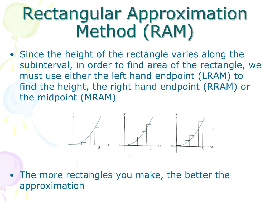 Rectangular Approximation Method (RAM) • Since the height of the rectangle varies along the subinterval, in order to find area of the rectangle, we must use either the left hand endpoint (LRAM) to find the height, the right hand endpoint (RRAM) or the midpoint (MRAM) • The more rectangles you make, the better the approximation
