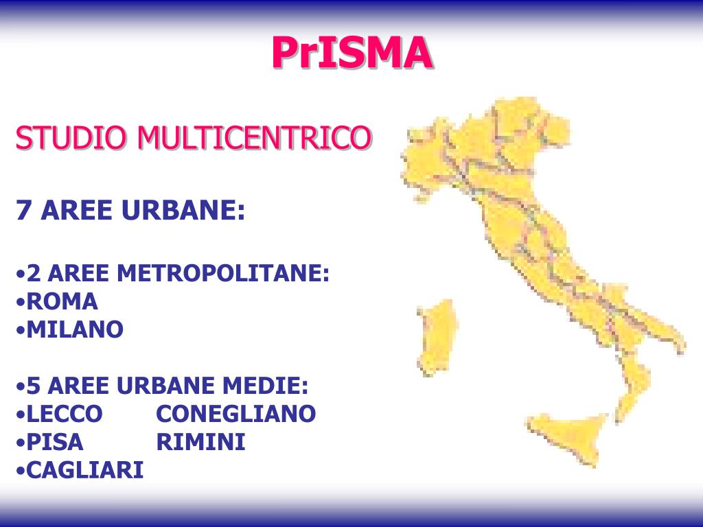 PrISMA • STUDIO MULTICENTRICO • 7 AREE URBANE: • 2 AREE METROPOLITANE: • ROMA • MILANO • 5 AREE URBANE MEDIE: • LECCO CONEGLIANO • PISA RIMINI • CAGLIARI