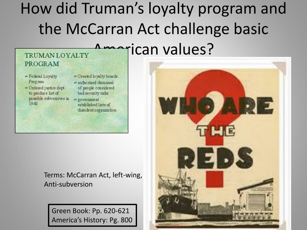 How did Truman’s loyalty program and the McCarran Act challenge basic American values? Terms: McCarran Act, left-wing, Anti-subversion Green Book: Pp. 620-621 America’s History: Pg. 800