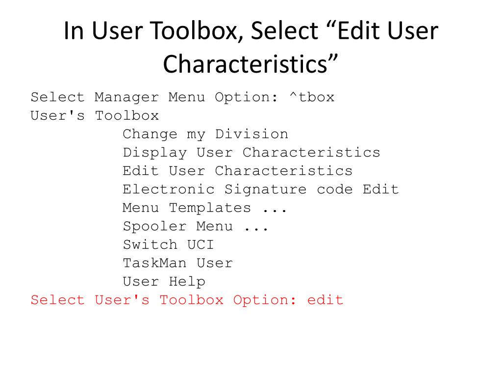 In User Toolbox, Select “Edit User Characteristics” Select Manager Menu Option: ^tbox User's Toolbox Change my Division Display User Characteristics Edit User Characteristics Electronic Signature code Edit Menu Templates ... Spooler Menu ... Switch UCI TaskMan User User Help Select User's Toolbox Option: edit