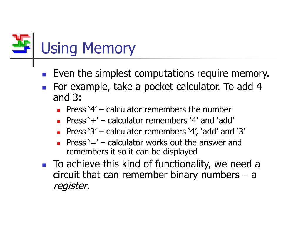 Using Memory • Even the simplest computations require memory. • For example, take a pocket calculator. To add 4 and 3: • Press ‘4’ – calculator remembers the number • Press ‘+’ – calculator remembers ‘4’ and ‘add’ • Press ‘3’ – calculator remembers ‘4’, ‘add’ and ‘3’ • Press ‘=’ – calculator works out the answer and remembers it so it can be displayed • To achieve this kind of functionality, we need a circuit that can remember binary numbers – a register.