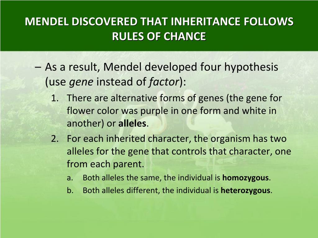 MENDEL DISCOVERED THAT INHERITANCE FOLLOWS RULES OF CHANCE • As a result, Mendel developed four hypothesis (use gene instead of factor): • There are alternative forms of genes (the gene for flower color was purple in one form and white in another) or alleles. • For each inherited character, the organism has two alleles for the gene that controls that character, one from each parent. • Both alleles the same, the individual is homozygous. • Both alleles different, the individual is heterozygous.
