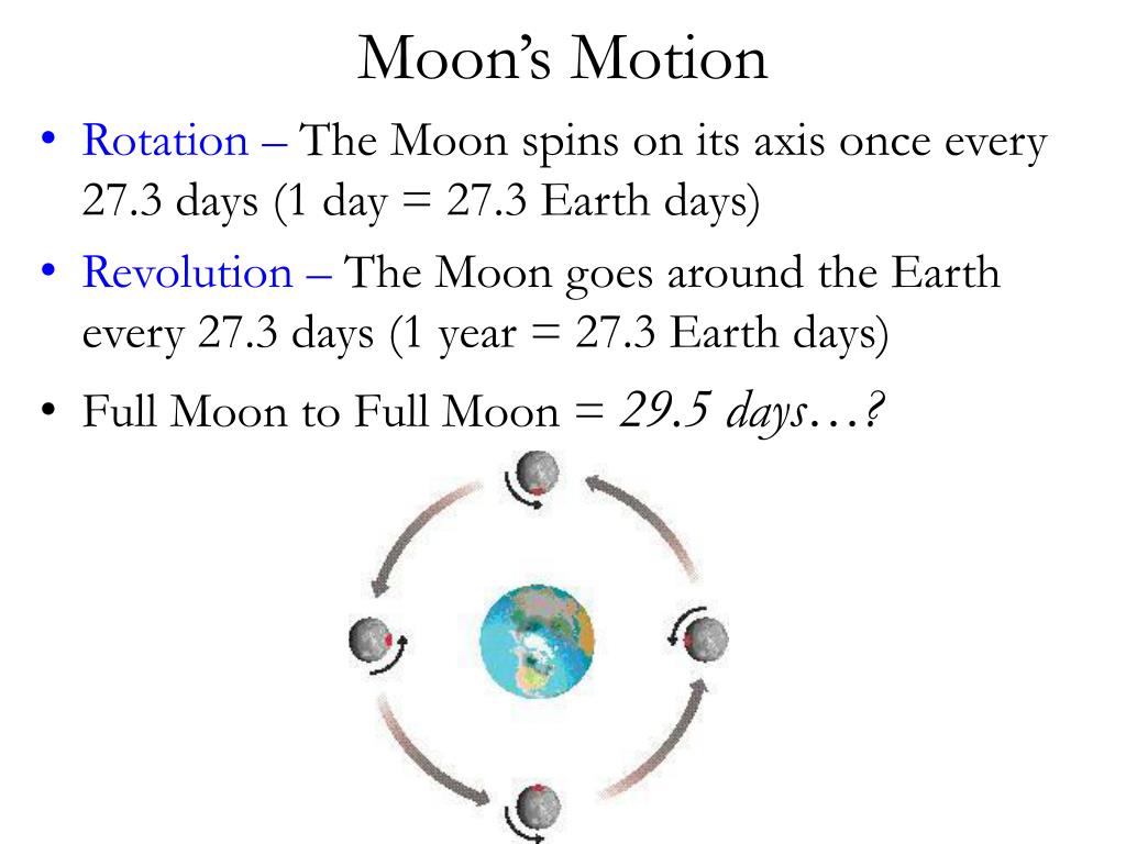 Moon’s Motion Rotation – The Moon spins on its axis once every 27.3 days (1 day = 27.3 Earth days) Revolution – The Moon goes around the Earth every 27.3 days (1 year = 27.3 Earth days) Full Moon to Full Moon = 29.5 days…?