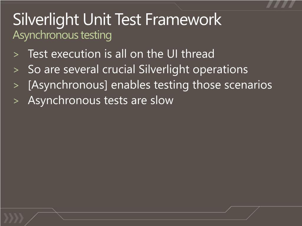 Silverlight Unit Test FrameworkAsynchronous testing • Test execution is all on the UI thread • So are several crucial Silverlight operations • [Asynchronous] enables testing those scenarios • Asynchronous tests are slow