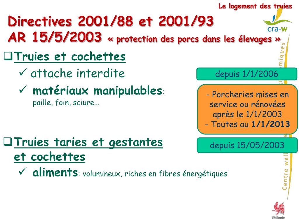 Le logement des truies Directives 2001/88 et 2001/93AR 15/5/2003 « protection des porcs dans les élevages » • Truies et cochettes • attache interdite depuis 1/1/2006 • matériaux manipulables: paille, foin, sciure… - Porcheries mises en service ou rénovées après le 1/1/2003 - Toutes au 1/1/2013 • Truies taries et gestanteset cochettes depuis 15/05/2003 • aliments: volumineux, riches en fibres énergétiques