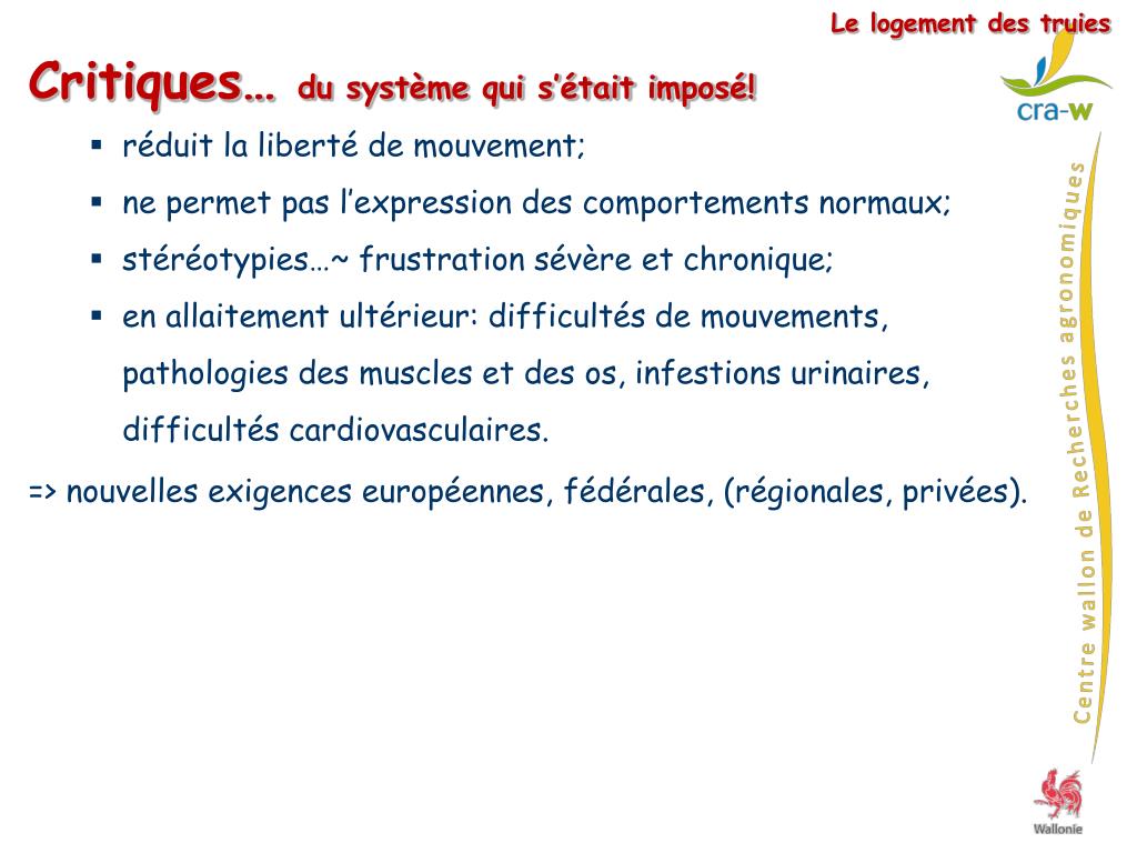 Le logement des truies Critiques… du système qui s’était imposé! • réduit la liberté de mouvement; • ne permet pas l’expression des comportements normaux; • stéréotypies…~ frustration sévère et chronique; • en allaitement ultérieur: difficultés de mouvements, pathologies des muscles et des os, infestions urinaires, difficultés cardiovasculaires. => nouvelles exigences européennes, fédérales, (régionales, privées).
