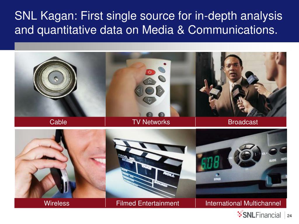 SNL Kagan : Exclusive data not available anywhere else. Easy to access, online. • Proprietary data, forecasts and studies provide the recognized benchmarks by which investors measure the performance and value of media companies • Operational and financial data on private companies (such as cable MSO’s) compiled by industry experts who also do valuations and M&A deal appraisals • News, data and analysis available online, linked and updated 24/7