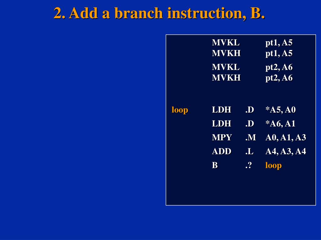2. Add a branch instruction, B. MVKL pt1, A5 MVKH pt1, A5 MVKL pt2, A6 MVKH pt2, A6 loop LDH .D *A5, A0 LDH .D *A6, A1 MPY .M A0, A1, A3 ADD .L A4, A3, A4 B .? loop