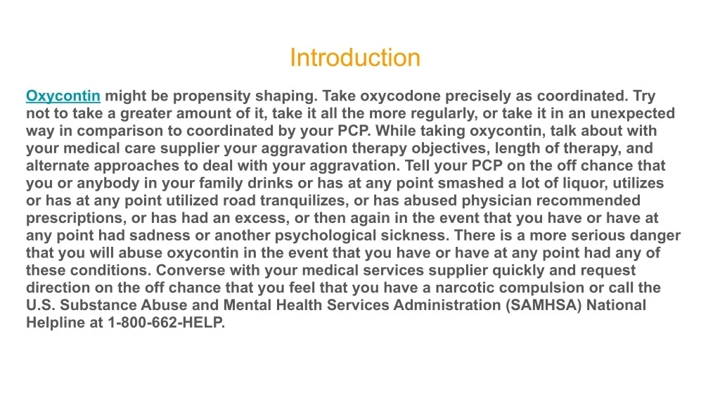 Introduction Oxycontin might be propensity shaping. Take oxycodone precisely as coordinated. Try not to take a greater amount of it, take it all the more regularly, or take it in an unexpected way in comparison to coordinated by your PCP. While taking oxycontin, talk about with your medical care supplier your aggravation therapy objectives, length of therapy, and alternate approaches to deal with your aggravation. Tell your PCP on the off chance that you or anybody in your family drinks or has at any point smashed a lot of liquor, utilizes or has at any point utilized road tranquilizes, or has abused physician recommended prescriptions, or has had an excess, or then again in the event that you have or have at any point had sadness or another psychological sickness. There is a more serious danger that you will abuse oxycontin in the event that you have or have at any point had any of these conditions. Converse with your medical services supplier quickly and request direction on the off chance that you feel that you have a narcotic compulsion or call the U.S. Substance Abuse and Mental Health Services Administration (SAMHSA) National Helpline at 1-800-662-HELP.