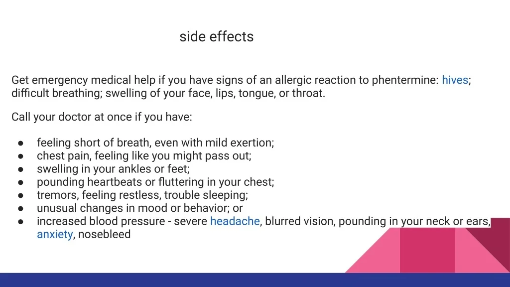 side effects Get emergency medical help if you have signs of an allergic reaction to phentermine: hives; difficult breathing; swelling of your face, lips, tongue, or throat. Call your doctor at once if you have: feeling short of breath, even with mild exertion; chest pain, feeling like you might pass out; swelling in your ankles or feet; pounding heartbeats or fluttering in your chest; tremors, feeling restless, trouble sleeping; unusual changes in mood or behavior; or increased blood pressure - severe headache, blurred vision, pounding in your neck or ears, anxiety, nosebleed ● ● ● ● ● ● ●