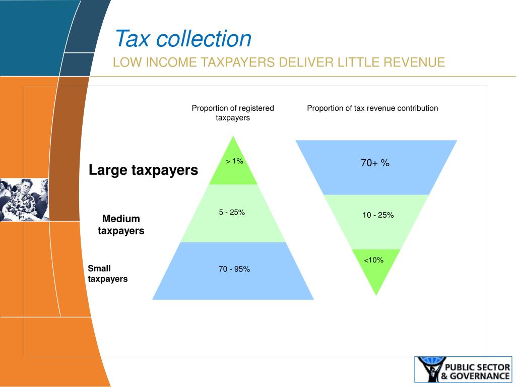 Proportion of registered taxpayers Proportion of tax revenue contribution > 1% 70+ % Large taxpayers 5 - 25% 10 - 25% Medium taxpayers <10% Small taxpayers 70 - 95% Tax collection Low income taxpayers deliver little revenue