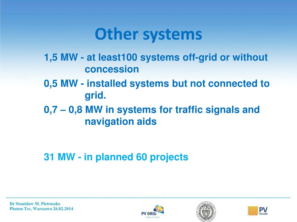 Other systems • 1,5 MW - at least100 systems off-grid or without concession • 0,5 MW - installed systems but not connected to grid. • 0,7 – 0,8 MW in systems for traffic signals and navigation aids • 31 MW - in planned 60 projects