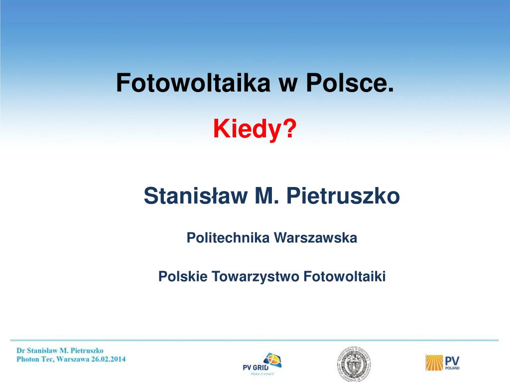 Fotowoltaika w Polsce. Kiedy? Stanisław M. Pietruszko Politechnika Warszawska Polskie Towarzystwo Fotowoltaiki