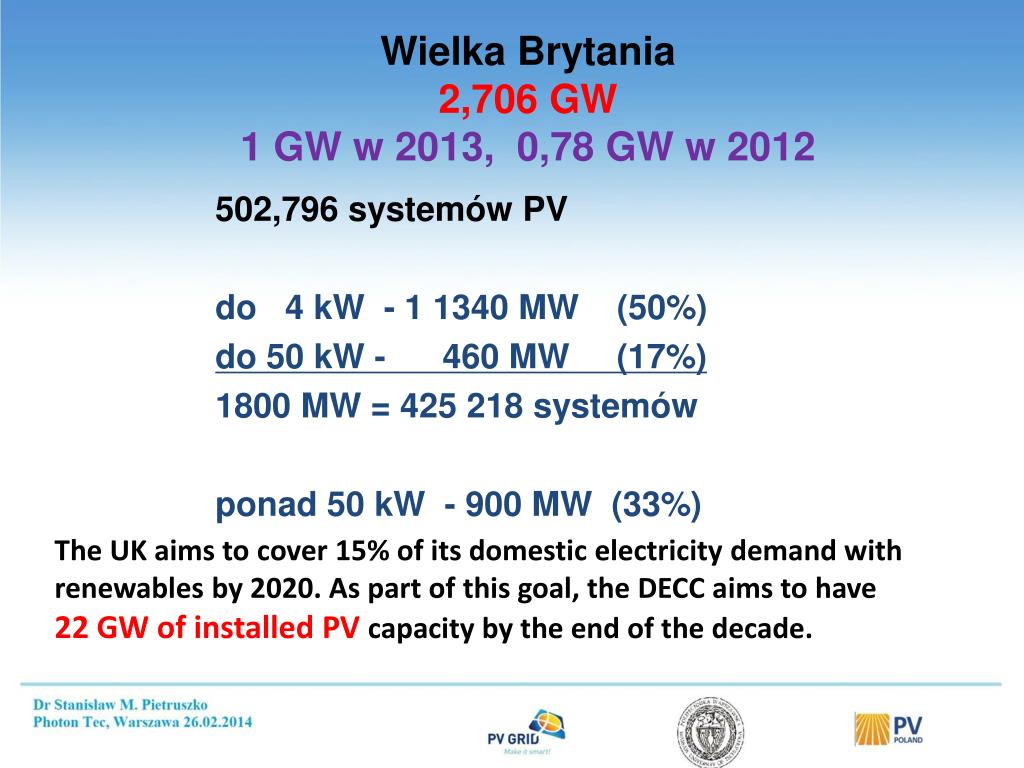 Wielka Brytania 2,706 GW 1 GW w 2013, 0,78 GW w 2012 502,796 systemów PV do4kW - 1 1340 MW (50%) do 50kW - 460 MW (17%) 1800 MW = 425 218systemów ponad 50kW -900MW (33%) The UK aims to cover 15% of itsdomesticelectricitydemandwithrenewables by 2020. As part of thisgoal, the DECC aims to have22 GW of installed PV capacity by theend of thedecade.