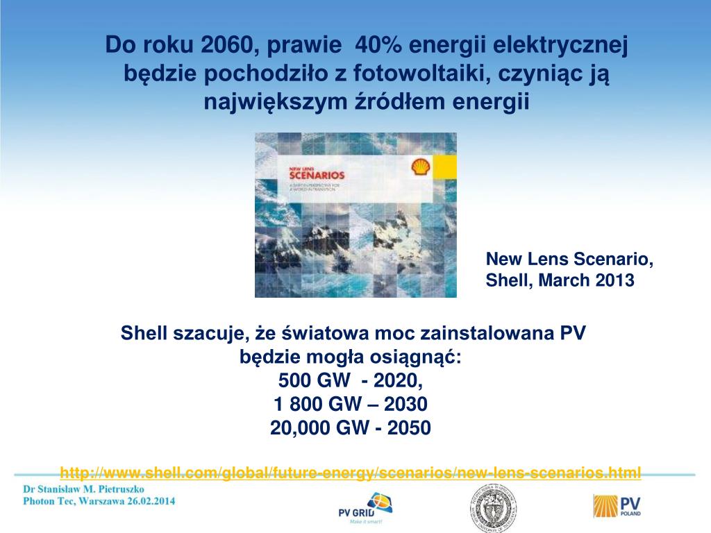 Do roku 2060, prawie 40% energiielektrycznej będzie pochodziło z fotowoltaiki, czyniąc ją największym źródłem energii Shell szacuje, że światowa moc zainstalowana PV będzie mogła osiągnąć:500 GW - 2020, 1 800 GW – 2030 20,000 GW - 2050 http://www.shell.com/global/future-energy/scenarios/new-lens-scenarios.html New LensScenario, Shell, March 2013