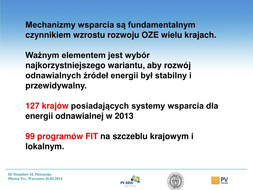 Mechanizmy wsparcia są fundamentalnym czynnikiem wzrostu rozwoju OZE wielu krajach. Ważnym elementem jest wybór najkorzystniejszego wariantu, aby rozwój odnawialnych źródeł energii był stabilny i przewidywalny. 127 krajów posiadających systemy wsparcia dla energii odnawialnej w 201399 programów FIT na szczeblu krajowym i lokalnym.