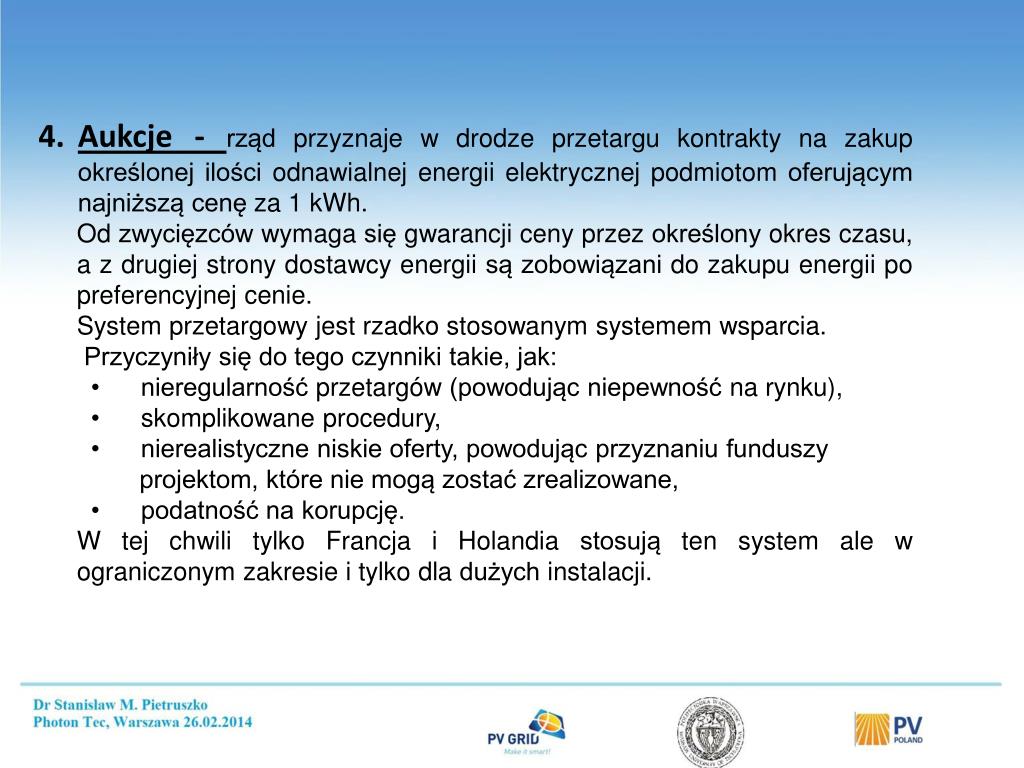 Aukcje - rząd przyznaje w drodze przetargu kontrakty na zakup określonej ilości odnawialnej energii elektrycznej podmiotom oferującym najniższą cenę za 1 kWh. • Od zwycięzców wymaga się gwarancji ceny przez określony okres czasu, a z drugiej strony dostawcy energii są zobowiązani do zakupu energii po preferencyjnej cenie. • System przetargowy jest rzadko stosowanym systemem wsparcia. • Przyczyniły się do tego czynniki takie, jak: • nieregularność przetargów (powodując niepewność na rynku), • skomplikowane procedury, • nierealistyczne niskie oferty, powodując przyznaniu funduszy projektom, które nie mogą zostać zrealizowane, • podatność na korupcję. • W tej chwili tylko Francja i Holandia stosują ten system ale w ograniczonym zakresie i tylko dla dużych instalacji.